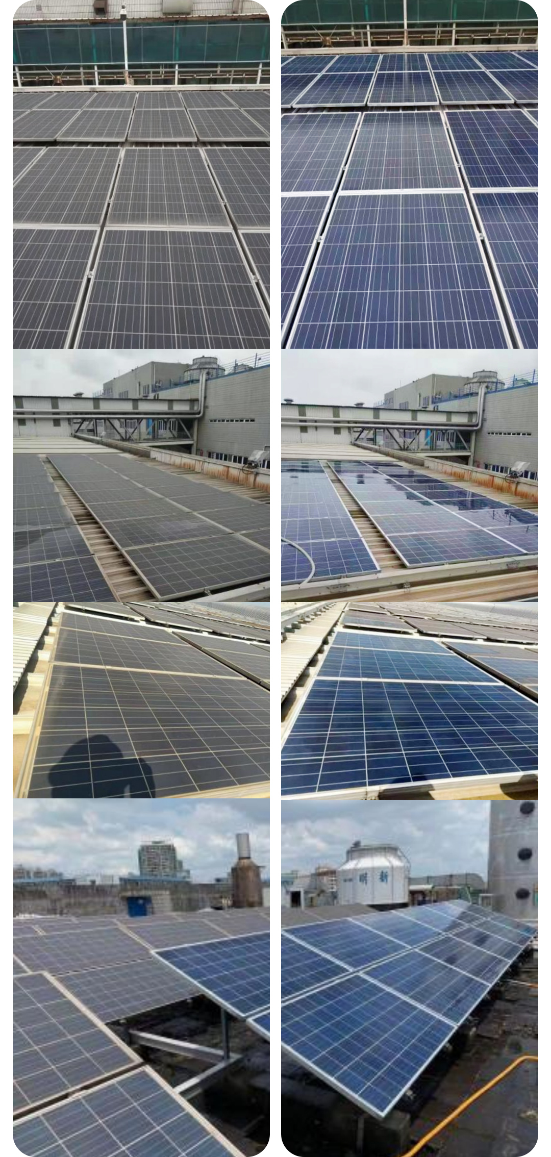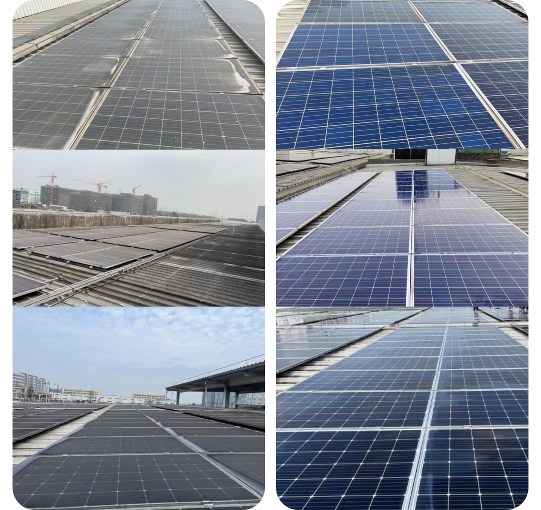 该项目屋顶水冷塔附近光伏组件表面结垢严重 ,污染物极为顽固,困扰电站运维多年,每年发电量损失10%以上。惠中RDS环保除污剂和清洁设备很好的解决了该问题,清洗后的组件如新,获得客户好评。