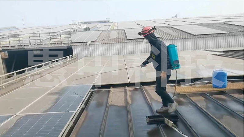 首先应用惠中高效除污剂,快速分解组件表面石灰粉尘等各类污染物。
